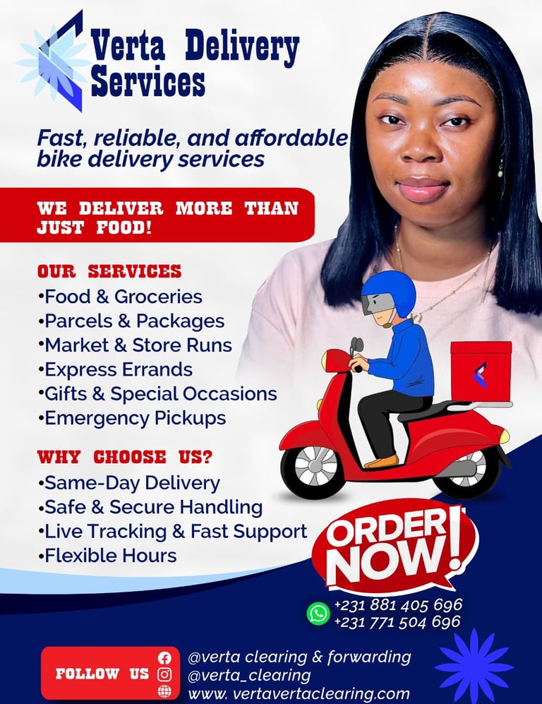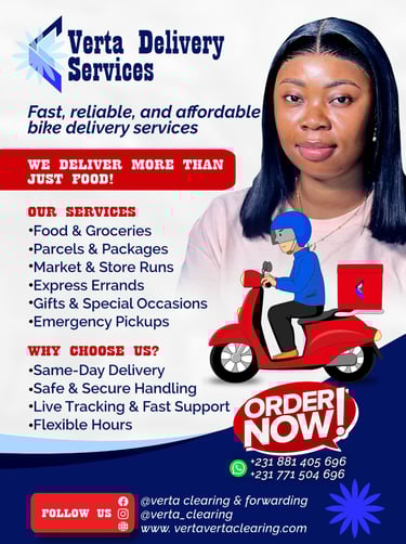 Welcome to Verta Delivery Service, your premier bike delivery partner in Montserrado County. We pride ourselves on providing fast, reliable, and affordable delivery solutions for a wide range of needs. Whether you're ordering food, sending parcels, or running errands, our professional riders ensure your items are handled safely and securely. With our same-day delivery service, live updates, and flexible hours, we make your convenience our top priority.